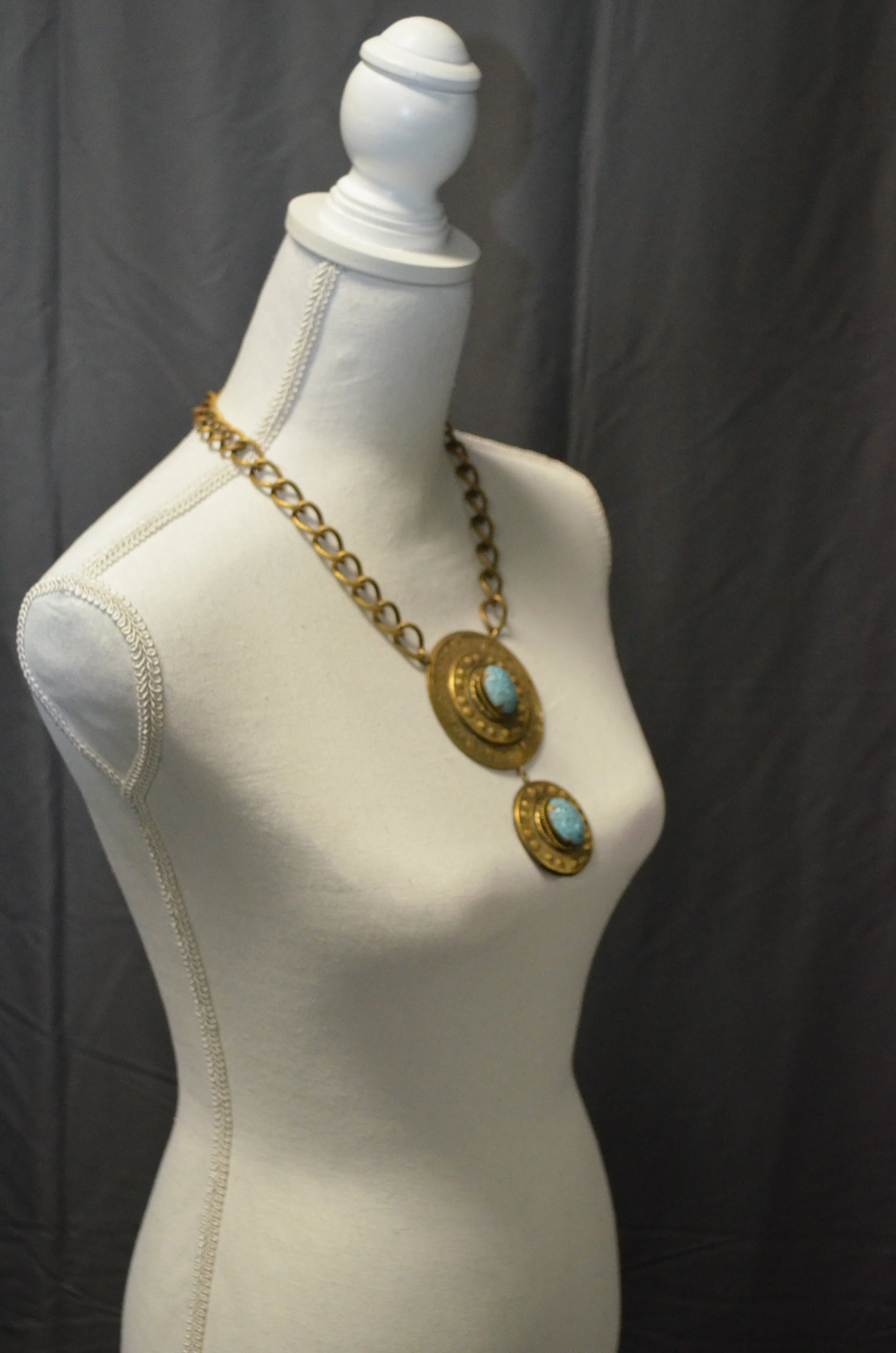 Large scarab drop gold earrings, with a small scarab disc on top, with a larger one hanging below. Finished in Joseff’s signature gold plating technique.